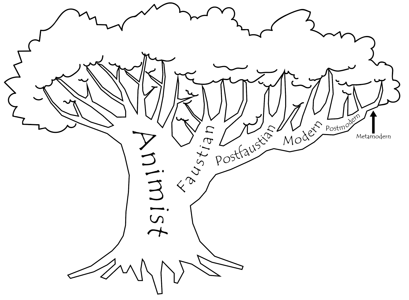 Okay, so let’s say you have these metamemes branching off organically from one another, where Animism is the biggest and oldest root, with tens of thousands of years of lived history. At least it’s better than a staircase of human history leading up to George H. W. Bush and the fall of the Berlin Wall. Modernity is just one of many ways that humans live and express themselves, fine. And Western societies are just one set of expressions, in turn, of modernity. There is so much human richness that arose long before anything one might call “modernity” ever appeared. And there do come beautiful and interesting things after and beyond it—sure, we can call that postmodern, if we want. A more critical and nuanced mind can notice that, for instance, an Amazon tribe’s shamanic practice can be wiser and more embodied than anything modern life ever cooked up in its soulless office landscapes.